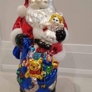 Santa with presents, doll, teddy bear and present sack.