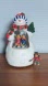 Charming snowman figurine featuring a snow globe scene. Accented with red, green, and blue details.
