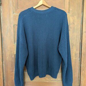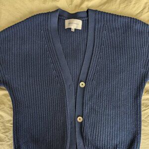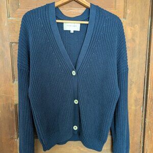 Navy blue size medium 100% cotton Tradlands Shelter cardigan. Beautiful sweater! I paid full price for this, plus shipping and duties, but I just don't reach for it enough.