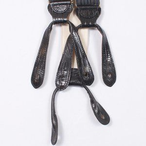 Trafalgar Men's Suspenders Navy beige Striped Silk. Black Tabs with embossed in reptile print.