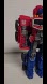 Classic red, blue, and silver design with molded mechanical detail and rolling wheels. Robot mode stands securely. Some light wear from use. No accessories or packaging included.