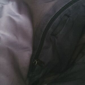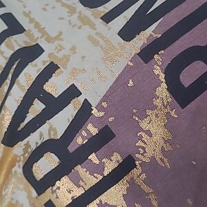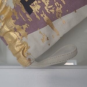 'Travel Rinse Repeat' print. Features gold and purple design. Nylon interior with pockets and a zippered pouch. 18x13