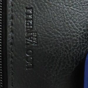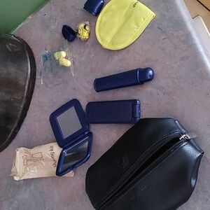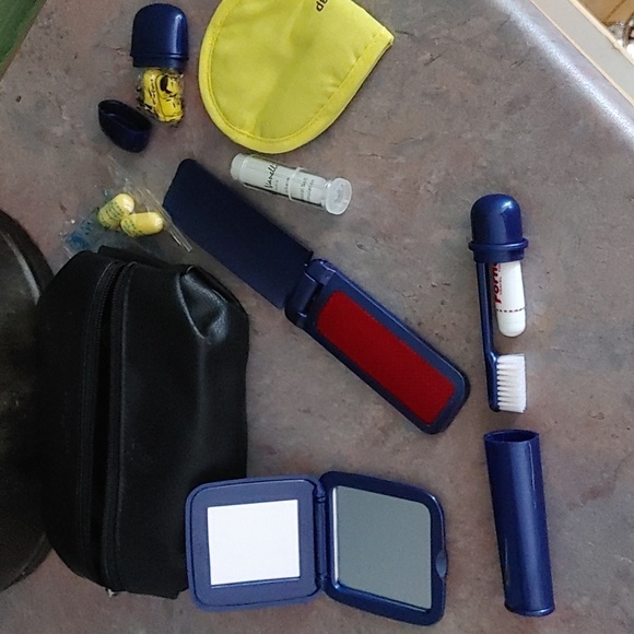 Ugo Vanelli case. Shaving kit in brown bag was not in original kit or the larger ear plugs (not packed as tightly). Case is black and in excellent condition. There is a tag spot. I have not tried to remove. Barely visible, last pic. Contents blue and yellow.