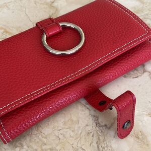 Handy faux red leather travel case for your jewelry. Snap closure, this compact case opens up to offer plenty of storage with