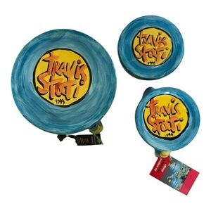 Travis Storti teapot, cream and sugar set. Quirky, hand painted beach scene, the ladies bikini top has 3-D boobies on the teapot 😜
