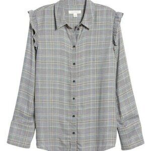 Treasure & Bond Ruffle Bell Sleeve Shirt Grey Titanium Glen Plaid Size XS NEW