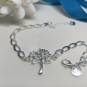 Shiny 925 sterling silver bracelet with a beautifully-sculpted tree. Gorgeous flat linked chain that moves beautifully on your wrist. The back of the tree design is a dimpled silver pattern, so the bracelet looks great on both sides. Brand new. Comes in a beautiful linen gift pouch and felt wrap.