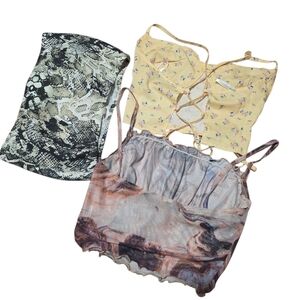 Set of three stylish crop tops. Includes a yellow floral, an abstract print, and a snake print design. Perfect for versatile styling.