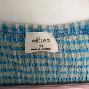 This is a cute blue and yellow plaid cropped top from Wilfred/ ARITZIA. The top is an XS. There are no signs of wear on the shirt. The top is light and stretchy. The fabric is smocked (sorta like ruched). The material is composed of 69% polyester, 30% cotton, 1% elastane.