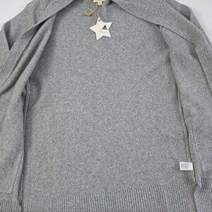 New with tags, Tres Chic women's long length grey wool blend open front long cardigan with two front patch pockets and side slits, size Medium.