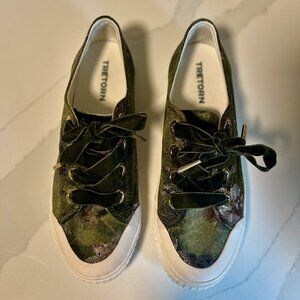 Super cute and comfortable Tretorn sneakers from Anthropologie are a must have item. No longer available in stores, these Marleyx4 olive green velvet sneakers have a subtle purple and cream floral print in the velvet to add to the richness of the look. Velvet laces and gold eyelets add another level of sophistication. The rubber soles are white (minimal wear marks) with a rubber cover over the toes.