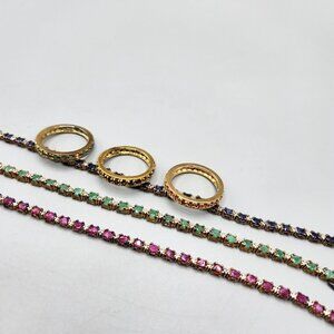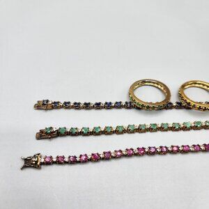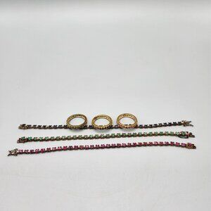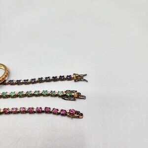 This beautiful set of matching tennis bracelets and rings are made of sterling silver and plated with a gold tone metal. Cubic zirconia stones decorate the bracelets and rings in pink, green and blue. Bracelets marked ADI 925 Thai and are all 7" long. Rings are marked 925 and are all size 8.75. Minor tarnish, excellent condition. Selling as a set only.
