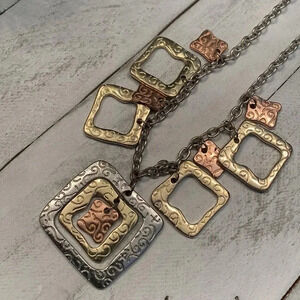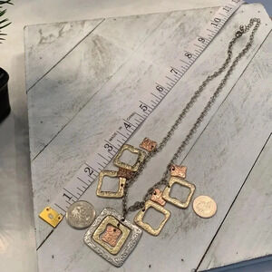 Attractive necklace, always receive compliments. A combo of gold, silver and copper tone metals. It’s been gently loved and is reflected in price.