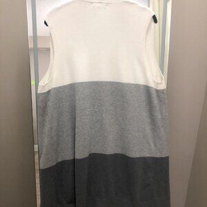This Tri-Colour Sleeveless Open Cardigan Sweater has never been worn and is in excellent condition. With pockets, this medium Peyton Primrose is great for all seasons. This garment comes from a smoke-free, pet-free home.