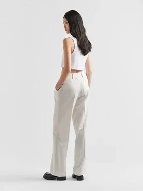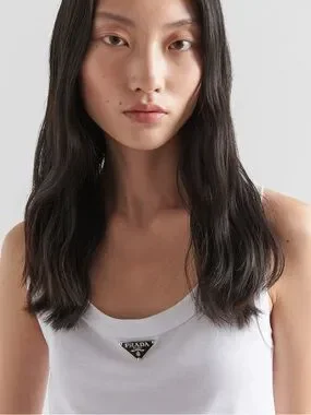Pragmatic garments acquire new importance and value. This tank top with a typical menswear line is transformed by a feminine touch. The garment embodies the luxury of simplicity. The triangle logo stands out on the front.