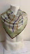 A vintage square scarf by Triangle, featuring a hand-printed abstract design in green, white, and gold with purple wave stripes. The border is finished in sage green with subtle trim accents. Measuring 31” square, this scarf is generously sized for versatile styling — perfect to wear around the neck, as a headscarf, or tied to a handbag.