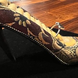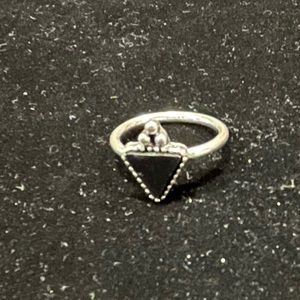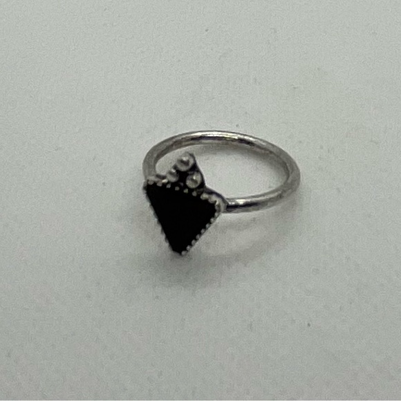 Small black triangle stone is set in dark silver-tone. Three silver-toned balls “crown” the triangle.
