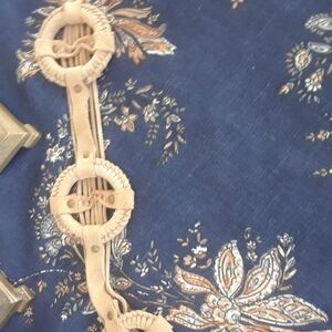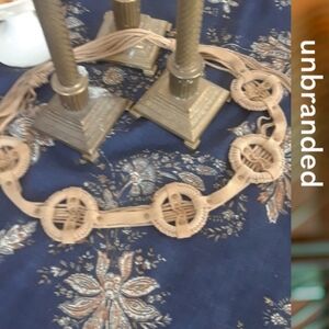 around steel rings with suede wrapped around them tasseled ends with strips of suede holding belt together with brass pins throughout it reinforce leather pieces