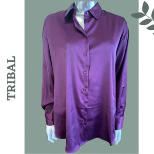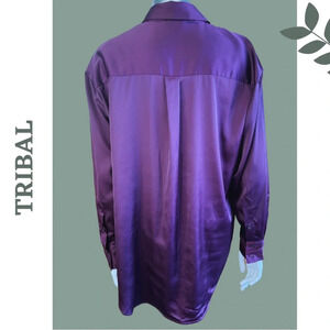 Tribal Black Orchid Long Sleeve Button Down Satin Shirt Purple Collared