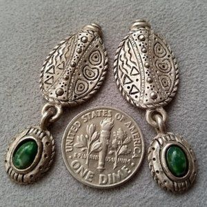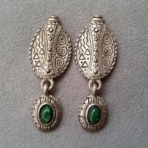 Beautiful dangled pierced earrings, made from silver, etched, detailed and hammered metal. Signed Venue, USA on back. They were made approx. in 60s and have a tribal look. The green stone looks like malachite, but I can not be sure. May be it is just Lucite which looks like gemstone.