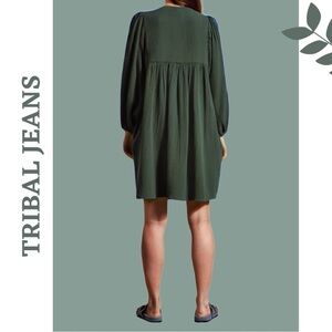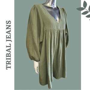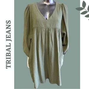 Tribal Jeans 53440-4555 - COTTON GAUZE PUFF SLEEVE DRESS Cactus Green Size Small