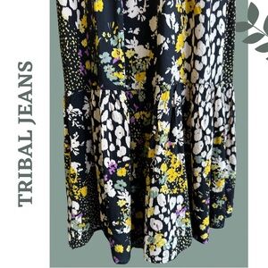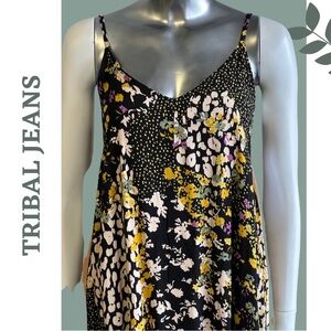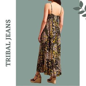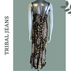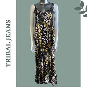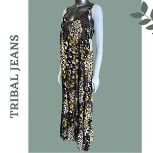 Tribal Jeans Floral Print Maxi Dress Back Elastic Smocking Black Yellow Size XS
