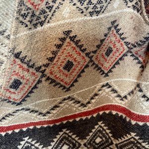 This distinctive vest is a perfect style to update your fall wardrobe. It is a fairly thick fabric with a beautiful cascading lapel. It has two front slash pockets. The design is a Southwest-inspired print with rich colors of taupe, navy, and red. Although this item has a small amount of wool in it, it does not feel scratchy.