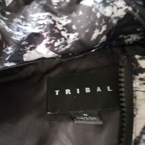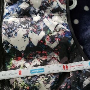 Stylish vest with a vibrant multicolor pattern. Features a front zipper and sleeveless design. Perfect for layering.