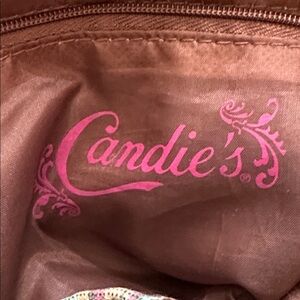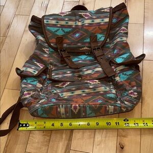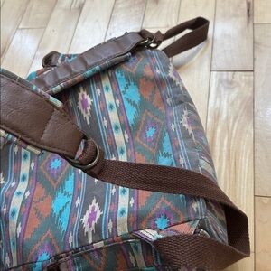 Vintage. Candie’s. Stylish tribal Aztec patterned backpack in brown, orange, turquoise, purple, and cream. Perfect for everyday use with a unique design. Has snap pockets on the sides and front. Snap closure to inside with drawstring, as well. Interior has a zipper pocket and open pocket.