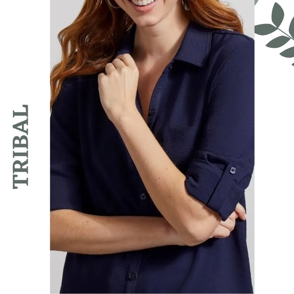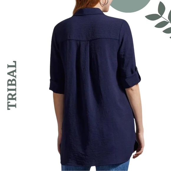 Polished and endlessly wearable, this navy button-up tunic from Tribal offers a relaxed silhouette with a textured finish that elevates its classic design. With a full front button closure, pointed collar, and chest pocket, this longline top is a perfect pairing with jeans, leggings, or even tucked into tailored trousers.