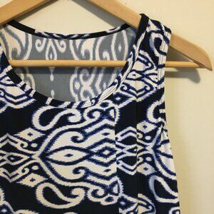 Very good preowned condition, handmade?, stretchy, sleeveless tank top featuring a boho-Aztec-tribal fusion print in dark navy blue, black and white. There's a break in the pattern on the left side for a slightly asymmetrical look which was nicely thought out.