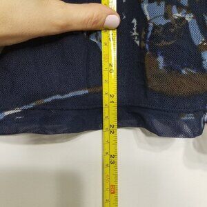 Tribal Sheer Abstract Print Navy Blue Top Asymmetrical Neckline Detail Sheer 3/4 Sleeves Stretch Blend Size Xsmall