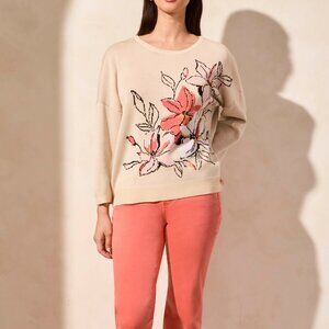 Fun and casual sweater from Tribal. Silky waffle fabric on a biscuit body with a geo-stitch flower.