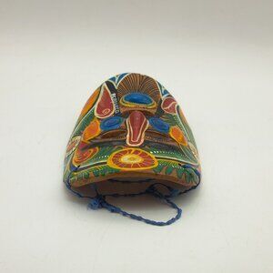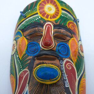 A ceramic tribal wall mask with colorful designs: green leaves, red and white flowers and more. It was made in Mexico and is marked "Acapulco."