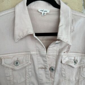 Great condition. Manufacturer distressing. Stylish and versatile pink denim jacket perfect for any occasion. Features a classic design with button closures and front pockets.