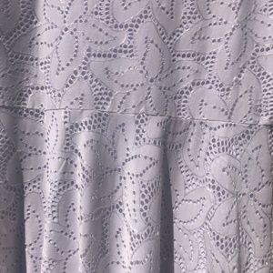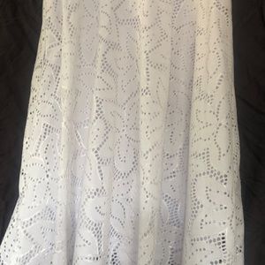 White eyelet material , flared lined sleeveless . Lg sz dress has “give” , packable easy wear excellent condition , length slightly above knee