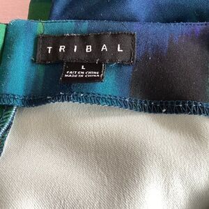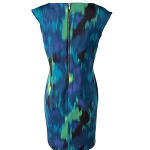 Green blue print, polyester spandex, 18” back zipper, knee length, boat neck, not lined, EUC, neck to hem 37”, armpit to armpit 19”.
