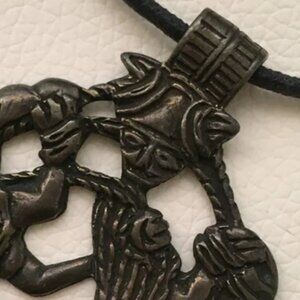 Very good preowned condition, bronzish pendant depicting the binding of the Trickster Loki. The pendant depicts an excerpt from Norse mythology where Loki was fastened to three rocks in the cave with the entrails of his slain son (it's a long story), which the gods had turned into iron chains. Skadi placed a poisonous snake on a rock above his head, where it dripped venom onto his face. But Loki’s faithful wife, Sigyn, sat by his side with a bowl that she held up to the snake’s mouth to catch the poison. But every so often, the bowl became full, and Sigyn would have to leave her husband’s side to dispose of its contents, at which point the drops that fell onto the unrepentant god’s face would cause him to shake violently, which brought about earthquakes in Midgard, the world of humanity. This was Loki's lot until he would break free and assist the giants in destroying the cosmos.
