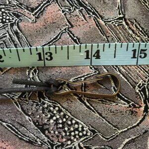 Pendant measures approximately 1.5" x 1.5". Leather strand + clasps measure about 14.5" long. I added another clasp to lengthen it; but I do recommend a new strand.