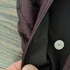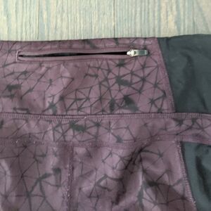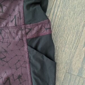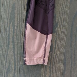 Cute pair of pink, burgundy and black leggings from Lululemon! The top front of the leggings has a pattern and then there is a black panel along the side with light pink panels on the calf. There is a zipper pocket on the back of the waistband with lager pockets on the side!