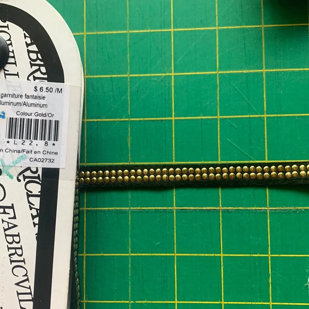 Iron on fancy trim. 60% polyester 40% aluminum. .5” wide