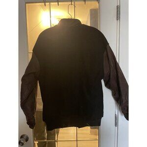Trimark black and brown wool/leather varsity jacket with knit trim, snap closures, slash pockets quilted lining and inside pocket, size XL