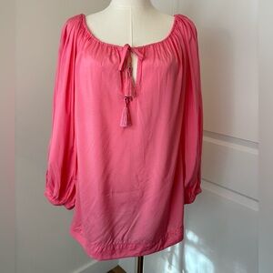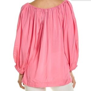 Sandia Top in candy with wide V-neck with self-tie detail and elbow-length puff sleeves