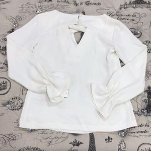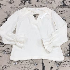We like a top with unexpected twists—like the keyhole detail and ruffled cuffs on this sophisticated Trina Turk style.