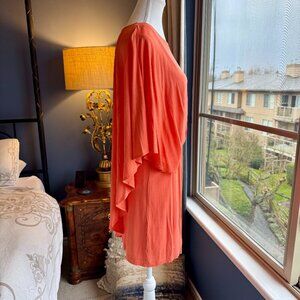 Trina Turk coral coloured mini dress, size 6. Very stretchy, can easily fit a S-M. Beautiful draping top that flows into a cape type back that goes the length of the dress, fitted skirt. Length of dress is 35.75 inches. Gold clasp at back of neck, lined, Great used condition. Cat friendly, nonsmoking home.