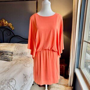 Trina Turk coral coloured mini dress, size 6. Very stretchy, can easily fit a S-M. Beautiful draping top that flows into a cape type back that goes the length of the dress, fitted skirt. Length of dress is 35.75 inches. Gold clasp at back of neck, lined, Great used condition. Cat friendly, nonsmoking home.