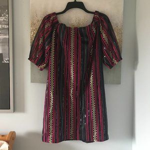 Size: 6. Lined. Intricate gold, pink, and navy pattern. Sequins throughout. Elasticized hem on sleeves.