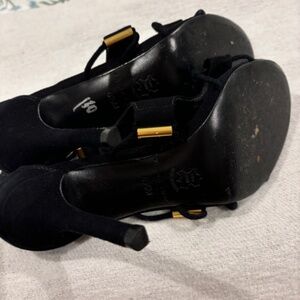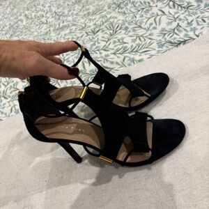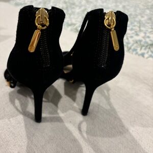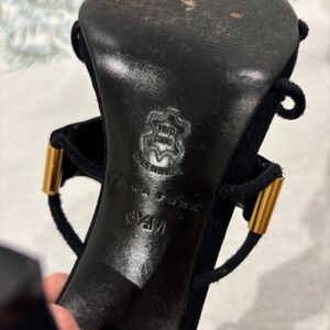 This gorgeous black suede strappy sandal is the perfect unique shoe for your collection. Featuring gold metal accents and unique shapes, this will be the sexiest sandal in your closet!