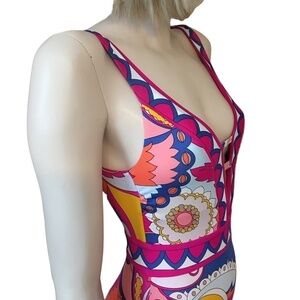 π©΄ π©± Vibrant colours pop in the bold print of this Trina Turk one-piece swimsuit that brings feminine flair to your poolside or beach attire with the strappy detail and plunging neckline.