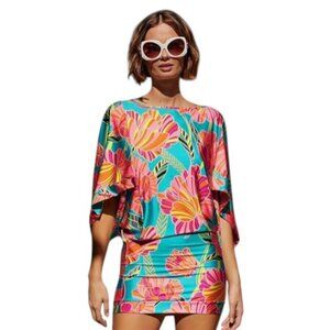 Trina Turk Poppy Tunic Dress, also known as a swim cover-up. It features a bright, colorful floral print with shades of pink, orange, and black on a blue background. The garment has a loose-fitting, pullover design with a boat neckline. The sleeves are wide, three-quarter length kimono style.